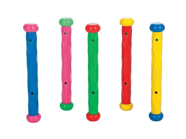 INTEX 55504 Vodní tyčinky do vody, vhodné pro potápění. Tyčinky po vhození do vody klesnou na jeho dno a děti tak mají výbornou hračku na procvičování potápění. Vhoďte tyčinky do vody, tyčinky klesnou na dno a děti mohou soutěžit, kdo je vyloví nejdříve. Díky výrazným barvám je lehké tyčinky ve vodě najít. Tyčinky jsou opatřeny různými čísly pro možné bodové ohodnocení vylovených tyčinek. Upozornění: Hra pod vodou může být nebezpečná a může vést k vážnému zranění a utonutí, příslušný dohled nad dětmi dospělým plavcem je za všech okolností nutný. Parametry:5 ks v baleníVhodné pro děti od 6 let5 různých barev