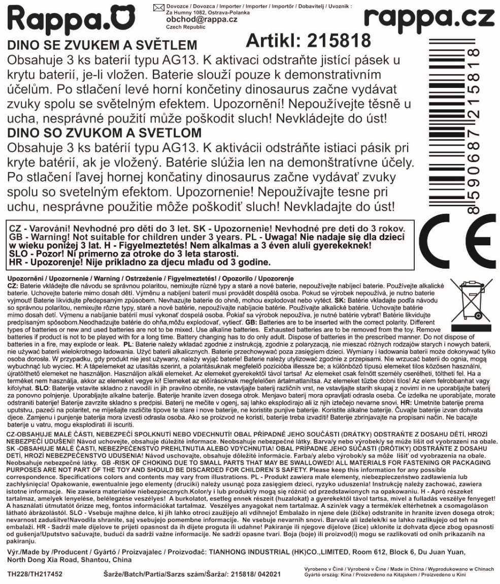 Hnědý dinosaurus se zvukem a světlem. Po stisknutí čelisti vydává správný dinosauří zvuk a svítí mu oči. Velikost 23 cm. Funguje na 3x 1.5V AG13 baterie, které jsou součástí balení.