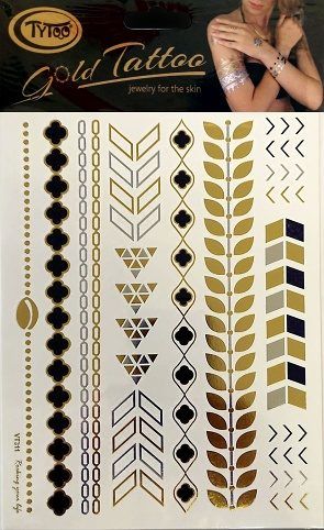 Zlaté tetování je klenot vaší pokožky. Tetovací náramky můžete použít na zápěstí, paži či okolo kotníku. Vytvořte speciální zlaté tetování během několika sekund! Trvanlivost: 2-7 dní v závislosti na typu pleti a použití! Tetování je odolné vůči vodě, dá se však lehce odstranit alkoholem nebo dětským olejíčkem. Velikost archu je 21x15 cm. Vhodné od 3 let.