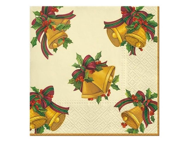 Vánoční ubrousek se zlatými zvonky Vánoční ubrousek je krásným doplňkem svátečního stolování. Motiv tradičních vánočních zvonků se zelenými lístky cesmíny, červenými bobulkami a barevnou stuhou vnese do vašeho domova kouzlo adventního času. Ubrousek je vyroben z kvalitního třívrstvého papíru, který zajišťuje vyšší odolnost. Skvěle poslouží při decoupage, scrapbookingových projektech nebo výrobě originálních dekorací, kde vynikne jeho detailní vánoční motiv. MOTIV: zvonky POČET UBROUSKŮ V BALENÍ: 20 ks Uvedená cena je za 1 balení po 20 ks.