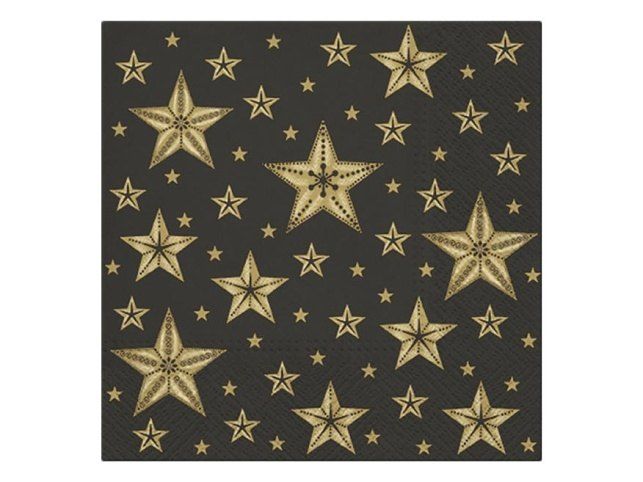 Vánoční ubrousek se zlatými hvězdami Výrazný kontrast černého podkladu a zlatých hvězd dělá z tohoto ubrousku elegantní doplněk sváteční tabule. Motiv působí moderně, slavnostně a skvěle se hodí k prostírání v kombinaci s bílým či zlatým nádobím. Ubrousek je vyroben z třívrstvého papíru, takže je pevný. Využijete ho při prostírání i jako součást zimních dekorací. MOTIV: hvězdy POČET UBROUSKŮ V BALENÍ: 20 ks Uvedená cena je za 1 balení (20 kusů).