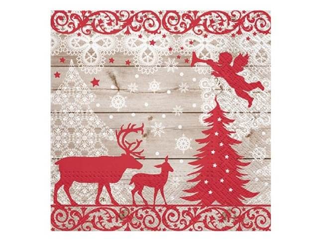 Vánoční ubrousek s motivem sobů a anděla Oživte svou sváteční tabuli originálním vánočním ubrouskem, na kterém se snoubí tradiční symboly Vánoc – majestátní sob se srnkou, červený vánoční strom a anděl s trumpetou. Jemné krajkové vzory na dřevěném podkladu dodávají ubrousku rustikální i elegantní nádech. Praktický třívrstvý ubrousek spojuje funkčnost s hezkým vzhledem. Hodí se jak na štědrovečerní tabuli, tak k ozdobení svátečního stolu. MOTIV: sobi, anděl POČET UBROUSKŮ V BALENÍ: 20 ks Uvedená cena je za 1 balení po 20 ks.