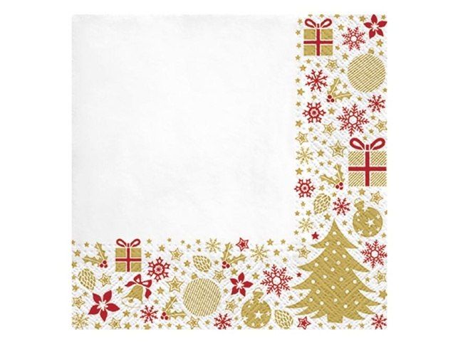 Papírový vánoční ubrousek s motivem vánočních symbolů, jako jsou dárky, stromečky, vločky a ozdoby. Tyto prvky jsou uspořádány kolem tří rohů, zatímco zbytek ubrousku zůstává bílý, což vytváří elegantní a čistý vzhled. Je vyroben z velmi kvalitního třívrstvého papíru. Tento ubrousek můžete využít při slavnostním stolování během vánočních svátků. Kromě toho může sloužit i jako dekorativní prvek při aranžování vánočních dekorací. MOTIV: vánoční symboly POČET UBROUSKŮ V BALENÍ: 20 ks Uvedená cena je za 1 balení po 20 ks.