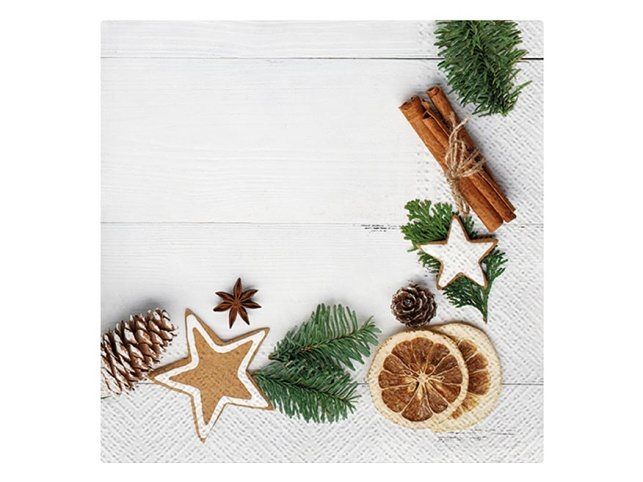 Papírový vánoční ubrousek s přírodním motivem skořice, větviček jehličí, šišek, sušeného pomeranče a perníčku. Je vyroben z velmi kvalitního třívrstvého papíru. Tento ubrousek je ideální pro sváteční stolování během Vánoc, kde jeho jednoduchý, ale stylový design doplní vánoční výzdobu. Je vhodný pro každou příležitost, kdy chcete vytvořit hřejivou a útulnou atmosféru. POČET UBROUSKŮ V BALENÍ: 20 ks MOTIV: skořice, větvičky jehličí, šišky, sušené pomeranče, perníček Uvedená cena je za 1 balení po 20 ks.