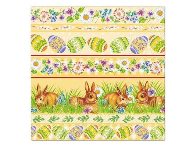 Papírový velikonoční ubrousek. Krásné velikonoční ubrousky s obrázky květin, kraslic a zajíců dodají prostřenému stolu nádech přicházejícího jara a vykouzlí příjemnou atmosféru u slavnostního oběda nebo večeře. Ubrousek je kvalitní z třívrstvého papíru. Vhodný i na ubrouskovou techniku a různé dekorace. MOTIV: květiny, kraslice, zajíci POČET UBROUSKŮ V BALENÍ: 20 ks Uvedená cena je za 1 balení po 20 ks.