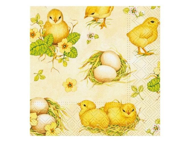 Papírový velikonoční ubrousek - Krásné velikonoční ubrousky dodají prostřenému stolu nádech přicházejícího jara a vykouzlí příjemnou atmosféru u slavnostního oběda nebo večeře. Ubrousek je velice kvalitní z třívrstvého papíru. MOTIV: kuřátka POČET UBROUSKŮ V BALENÍ: 20 ks Uvedená cena je za 1 balení po 20 ks.
