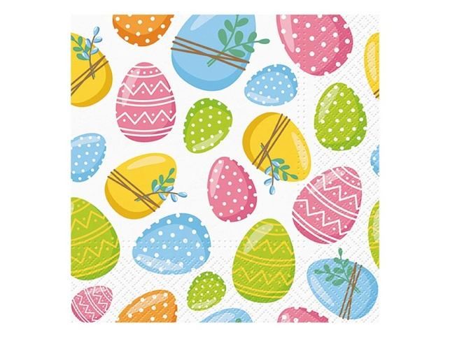Veselé barvy a hravé vzory velikonočních vajíček vytvářejí živý motiv, který rozzáří každý jarní stůl. Puntíky a jemné ornamenty dodávají designu lehkost a radostnou velikonoční náladu, aniž by působil přeplácaně. Velikonoční ubrousek je vyroben z třívrstvého papíru, který zajišťuje dobrou pevnost a savost při používání. Spojuje výrazný vzhled s praktickou funkcí a využijete ho při stolování, pohoštění i jarních oslavách. Motiv: kraslice Rozměr: 33 × 33 cm POČET UBROUSKŮ V BALENÍ: 20 ks Uvedená cena je za 1 balení (20 kusů).
