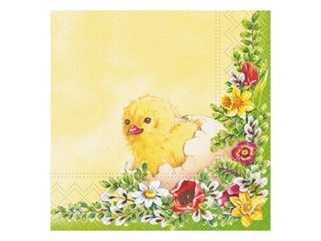 Na velikonočním ubrousku je zachyceno kuřátko vylíhnuté ze skořápky obklopené jarními květy v teplých žlutých a zelených tónech. Jemná ilustrace působí mile a dotváří velikonoční atmosféru. Tři vrstvy papíru dávají ubrousku příjemnou pevnost i savost, takže se hodí nejen jako dekorace, ale i pro každodenní používání během jara a velikonočních svátků. Rozměr: 33 × 33 cm Motiv: kuřátko, květy POČET UBROUSKŮ V BALENÍ: 20 ks Uvedená cena je za 1 balení (20 kusů).