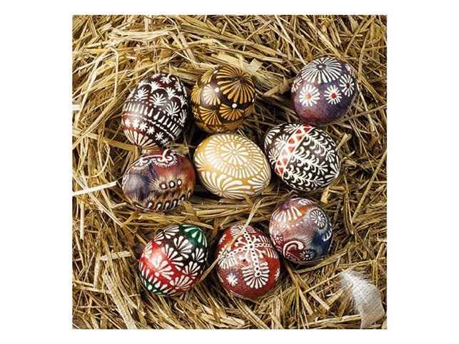 Tradiční zdobené kraslice uložené ve slámě vytvářejí výrazný a autentický motiv, který odkazuje na lidové velikonoční zvyky. Přírodní barevnost v kombinaci s bohatými ornamenty dodává velikonočnímu ubrousku rustikální a hřejivý vzhled, který okamžitě evokuje sváteční atmosféru. Motiv je ideální pro klasicky laděné velikonoční stolování a potěší každého, kdo má rád tradice a řemeslný styl. Třívrstvé provedení zajišťuje potřebnou pevnost a savost při používání. Motiv: kraslice Rozměr: 33 × 33 cm POČET UBROUSKŮ V BALENÍ: 20 ks Uvedená cena je za 1 balení (20 kusů).