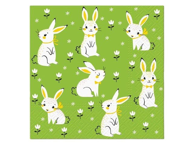Papírový velikonoční ubrousek. Krásné velikonoční ubrousky s obrázky králíčků dodají prostřenému stolu nádech přicházejícího jara a vykouzlí příjemnou atmosféru u slavnostního oběda nebo večeře. Ubrousek je kvalitní z třívrstvého papíru. Vhodný i na ubrouskovou techniku a různé dekorace. MOTIV: králíčci BARVA: zelená POČET UBROUSKŮ V BALENÍ: 20 ks Uvedená cena je za 1 balení po 20 ks.