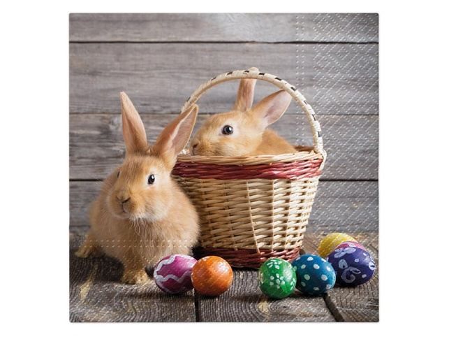 Papírový velikonoční ubrousek. Krásné velikonoční ubrousky s obrázky králíčků, kraslic a košíku dodají prostřenému stolu nádech přicházejícího jara a vykouzlí příjemnou atmosféru u slavnostního oběda nebo večeře. Ubrousek je kvalitní z třívrstvého papíru. Vhodný i na ubrouskovou techniku a různé dekorace. MOTIV: králíčci, kraslice, košík POČET UBROUSKŮ V BALENÍ: 20 ks Uvedená cena je za 1 balení po 20 ks.