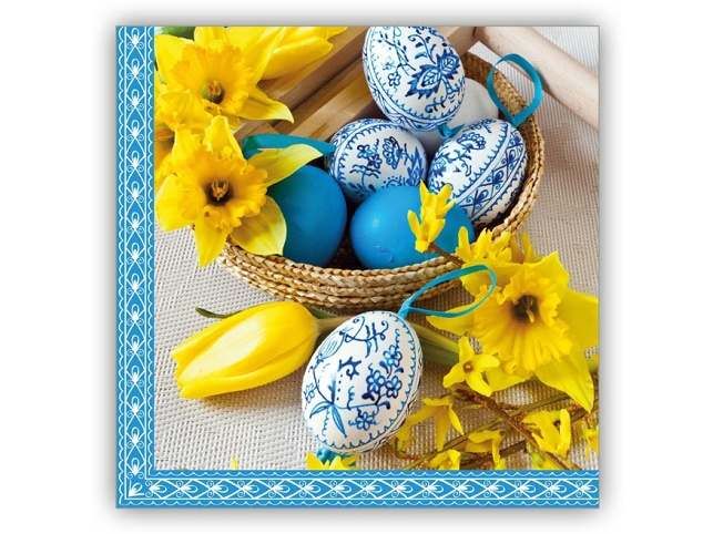 Papírový velikonoční ubrousek. Krásné velikonoční ubrousky dodají prostřenému stolu nádech přicházejícího jara a vykouzlí příjemnou atmosféru u slavnostního oběda nebo večeře. Ubrousek je velice kvalitní z třívrstvého papíru. MOTIV: žluté tulipány a modré kraslice POČET UBROUSKŮ V BALENÍ: 20 ks Uvedená cena je za 1 balení po 20 ks.