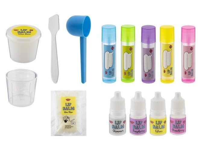 Udělej si svůj vlastní balzám na rty. Sada obsahuje 6 tubiček na balzám, 4 různé příchutě balzámu, balzám, odměrky, kalíšek na výrobu, obrázkový návod.