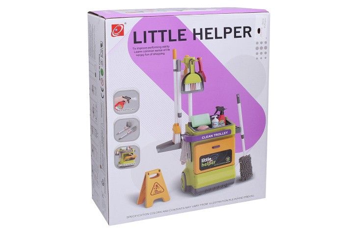 Úklidový set s vozíkem. Rozměry 33,5x31,5x71 cm. Vozík, lopatka velká, lopatka malá, smeták velký, smeták malý, smetáček, prachovka, stěrka na okna, mýdlo, 2 čistící prostředky ve spreji, podložka, pouzdro. varovná cedule. Obrázkový návod na složení na obalu.