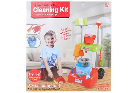 Úklidový vozík s doplňky. Balení obsahuje vozík o velikosti cca 45 x 36 x 26 cm, kbelík, smetáček, lopatku, mop a další doplňky. Rozměry balení cca 41 x 43 x 12 cm. Věk 3+