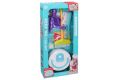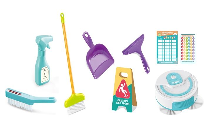 Uklízecí set. Obsahuje robotický vysavač 17cm, smeták, lopatku se smetáčkem, stěrku, lahvičku s rozprašovačem, ceduli pozor mokrá podlaha, kartičku s nálepkami. Baterie 3xAA nejsou součástí.