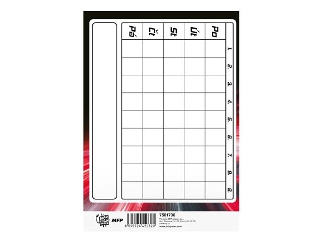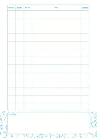 Každý den může mít tempo závodní dráhy. MFP úkolníček je skvělým pomocníkem pro školáky i fanoušky rychlých kol, kteří chtějí mít své povinnosti přehledně naplánované a pod kontrolou. Dynamický design s formulí a stylizovaným okruhem dodává zapisování úkolů a poznámek energii, takže plánování není nuda, ale jízda na plný plyn. Praktický formát A5 se snadno vejde do batohu a nabízí dostatek prostoru pro každodenní školní zápisy. ÚKOLNÍČEK OBSAHUJE: - osobní údaje - telefonní čísla - prostor pro poznámky - malou násobilku - geometrické a matematické vzorce - vyjmenovaná slova - rozvrh hodin Formát: A5 Motiv: formule Počet stran: 40 Uvedená cena je za 1 ks.