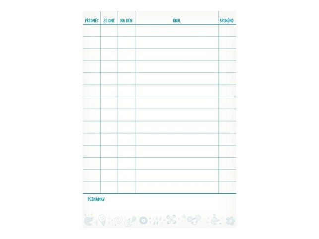 Úkolníček s obrázkem jednorožce - Nepamatuje si Vaše dítě, co má dělat za úkoly? Kupte mu úkolníček, který slouží k přehlednému zapisování domácích úkolů. Úkolníček obsahuje: - osobní údaje - telefonní čísla - prostor pro poznámky - malá násobilka - geometrické vzorce a matematické vzorečky - vyjmenovaná slova - rozvrh hodin Formát: A5 Počet stran: 40 stran Uvedená cena je za 1 ks.