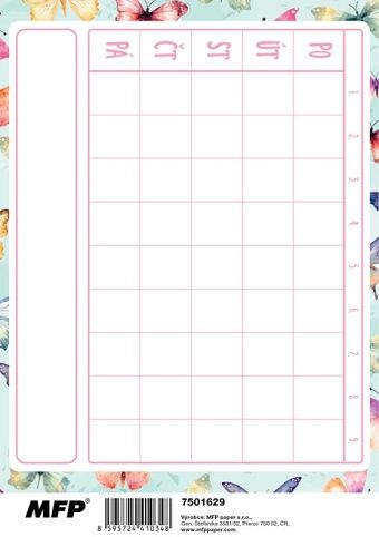 S tímto úkolníčkem ve formátu A6 bude plnění školních povinností hračka! Pestrobarevní motýli na obálce přinesou kouzelnou náladu do každého školního dne a zapisování úkolů se promění v zábavu. Praktický formát se perfektně vejde do každé aktovky, takže úkolníček bude vždy připraven na další důležitý zápis. Ať už jde o domácí úkol, připomínku na test nebo plán na školní projekt, tento úkolníček zvládne všechno! ÚKOLNÍČEK OBSAHUJE: - osobní údaje - telefonní čísla - prostor pro poznámky - malá násobilka - geometrické vzorce a matematické vzorečky - vyjmenovaná slova - rozvrh hodin Formát: A6 Motiv: motýli Počet stran: 40 stran Uvedená cena je za 1 ks.