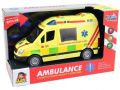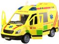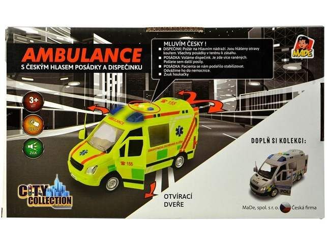 Vůz rychlé zdravotnické záchranné služby v reálném zbarvení a designu ambulance, známé z českých silnic. Ambulance jezdí na setrvačník a je vybavena funkčním majákem s modrými výstražnými světly a hlasem posádky vozu a dispečinku. Otevírací dveře. Měřítko modelu 1:16, délka auta 21 cm. DISPEČINK: "Požár na Hlavním nádraží. Jsou hlášeny otravy kouřem. Všechny posádky v terénu k zásahu". POSÁDKA: "Voláme dispečink. Je zde více raněných. Pošlete sem další posily". POSÁDKA: "Pacienta se nám podařilo stabilizovat. Odvážíme ho do nemocnice". Ambulance je na napájena třemi bateriemi AG13, které jsou součástí hračky. Doporučený věk 3+. Rozměry boxu 27 x 11 x 16 cm.