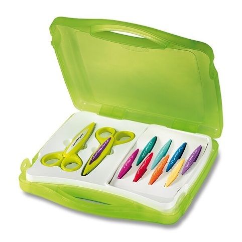 Umělecké kreativní nůžky pro děti i dospělé. Snadno vyměnitelné dekorativní čepele ze skelného vlákna. Nemohou stříhat látku, vlasy ani kůži. Stříhají papír 40 až 250 g. Kufřík obsahuje 2 ks nůžek a 10 ks čepelí s různými vzory.