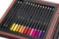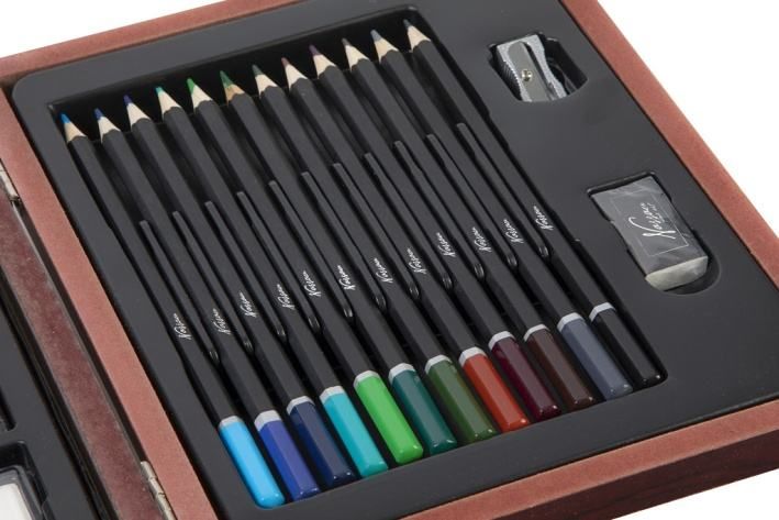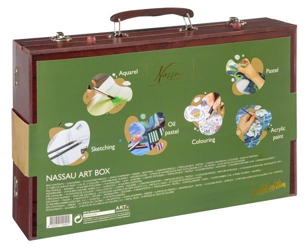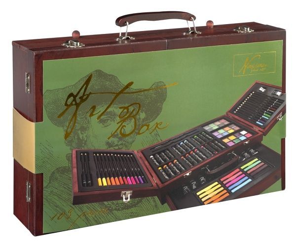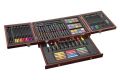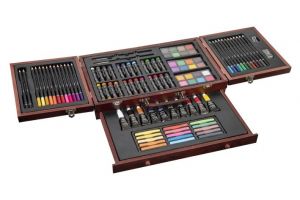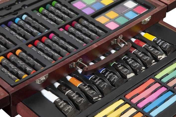 Umělecký kufřík dřevěný naplněný – má dvě rozkládací patra a obsahuje 103 ks různých potřeb pro malíře (omalovánky, vodové barvy, akrylové barvy, pastelky, štětce, gumu, ořezávátko atp.)