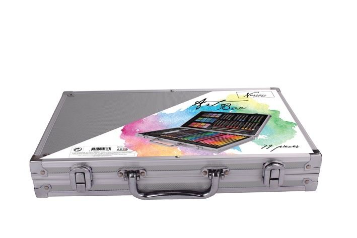 Umělecký kufřík kovový naplněný – obsahuje 79 ks různých potřeb pro malíře ( vodové barvy, pastelky, štětce, gumu, ořezávátko atp.)