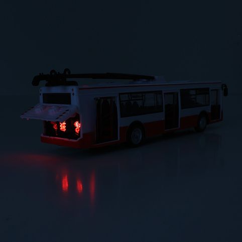 Rychle nastoupit, zavřít dveře a jedeme! Originální trolejbus, který oznamuje stanice v českém jazyce a jezdí na zpětný chod. Dveře lze manuálně otevřít a zavírají se pomocí tlačítka umístěného na střeše vozu. Při každém otevření se ozve hlášení, při zavření navíc blikají přední světla trolejbusu. Trolejbus je vyroben z plastu v délce 28 cm a vyžaduje použití 3 ks baterií, které jsou jeho součástí. Tahle unikátní hračka nesmí ve vaší sbírce rozhodně chybět!