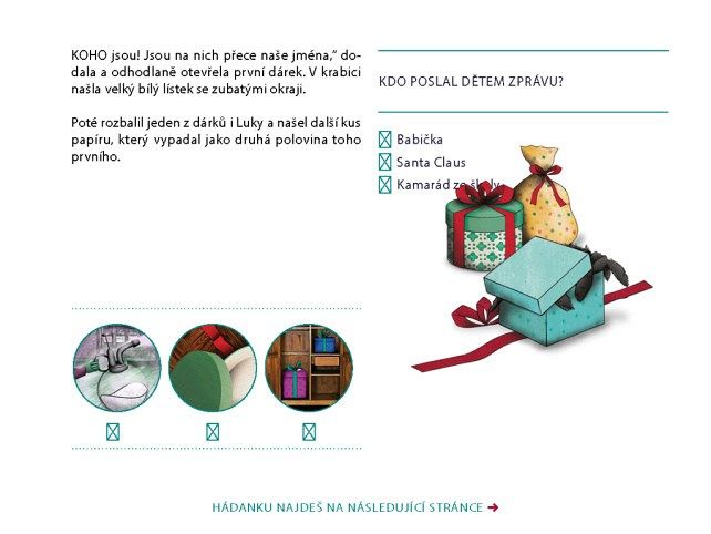 Tři záhadné dárky s tajemným vzkazem zavedou Tonču a jejího bratra Lukyho na vzrušující dobrodružnou výpravu. Santa Claus byl unesen, létající sobi i vánoční skřítci jako by zmizeli z povrchu zemského a je na nich, aby všemu přišli na kloub! Pomáhá jim při tom pavouček Melita a věčně hladový sob Rudolf. Máte dost odvahy a důvtipu? Pomůžete Tonče a Lukymu? Jen když s nimi postupně vyluštíte všech 24 zapeklitých hádanek, dokážete osvobodit Santu Clause!