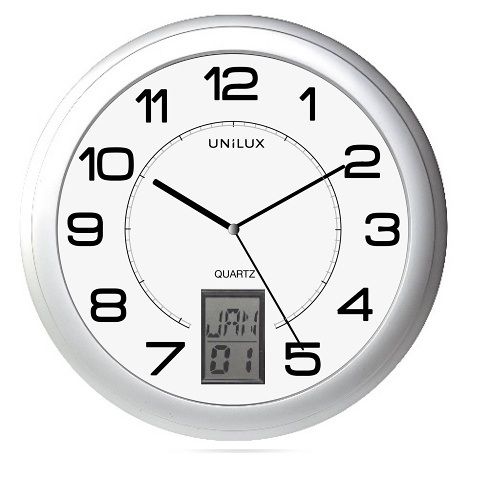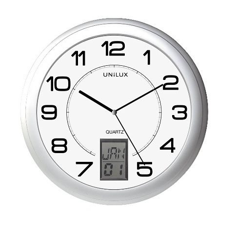 Průměr 31 cm, 0,14 mA, 35 m viditelnost, Quartz mechanismus, tiché, velké číslice, digitální datum, skleněné okénko a platový rám, baterie 1 AA součástí