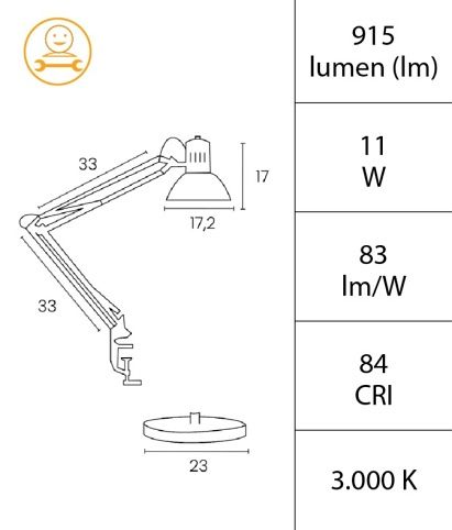 LED, podstavec 23 cm, rameno 33 + 33 cm a hlava 17,2 x 17 cm z epoxidovaně lakované oceli a recyklovaného hliníku, 915 cm, 11 W, 83 lm/W 84 CRI, 3000 K, pohyblivé ramenobarva, dokonalá stabilita