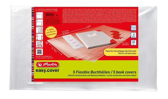 Univerzální obal na knihy easy.cover 5ks, pro všechny běžné formáty, pro rozměry až 335 x 540 mm, silná PP fólie 110 my,6 x sada 4 červených rohů, 5 x jmenovka, QR kód pro ilustrační video, v polybagu