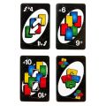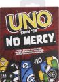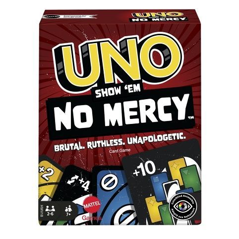 UNO Show 'em No Mercy je naše dosud nejbrutálnější hra UNO! Obsahuje spoustu dalších karet s mnohem tvrdšími postihy (kdo si chce vzít 10 karet?) a nová pravidla, díky kterým budou hráči střádat, vyměňovat a tahat více karet než kdykoli předtím! A dokonce je tu i pravidlo milosrdenství (ano, chápeme tu ironii), pokud se věci stanou příliš drsnými. V této nemilosrdné verzi klasické hry můžete vyhrát dvěma způsoby: zbavit se všech karet NEBO vyřadit všechny ostatní hráče ze hry! A pokud se vám podaří dosáhnout chvíle, kdy budete mít v ruce jen jednu kartu, nezapomeňte zakřičet „UNO!“.