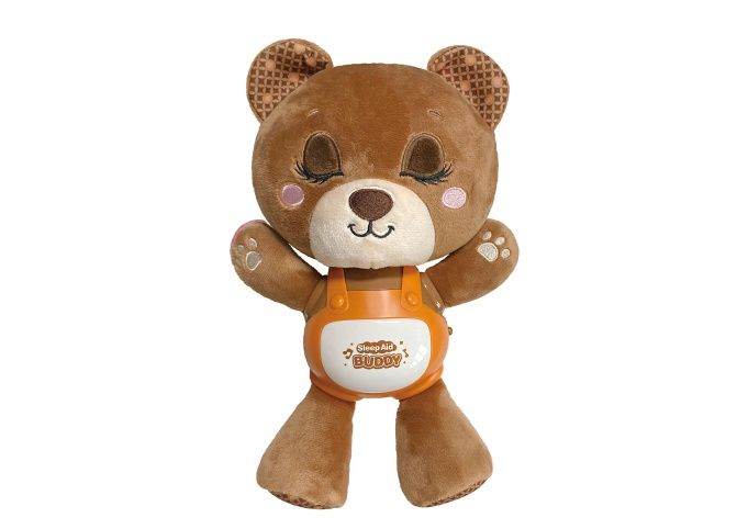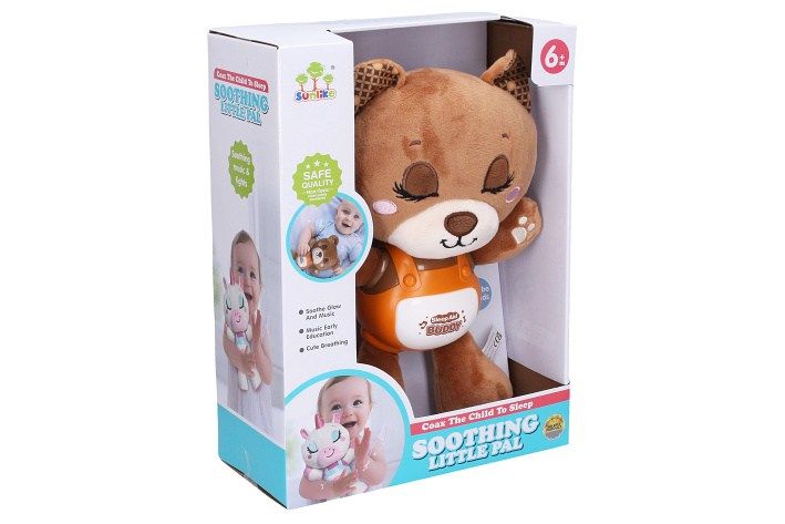 Usínáček medvěd. Velikost 29 cm. baterie 3xAAA nejsou součástí. Přepínač on/off na boku zvířátka. Stisknutím bříška se spouští zvukové efekty- 1. stisknutí ukolébavka, 2. stisknutí uklidňující hudba, 3. stisknutí chrápání, 4. stisknutí pouze světlo, 5. stisknutí vypnutí, 6. stisknutí - proměnlivý režim.
