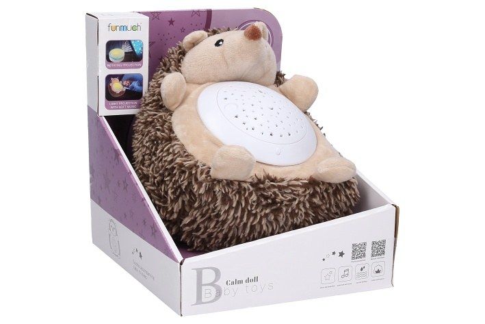 Usínací ježek s projekcí. Velikost 20 cm. Baterie 3xAAA nejsou součástí. Projektor na bříšku ježka svítí, hraje a otáčí se. Otočením projektoru proti směru hodinových ručiček se spustí ukolébavka a během hraní se projektor otáčí do původní polohy. Tím se hýbe i projekce hvězdné oblohy. Projektor jde vyjmout z bříška ježka. Dozadu projektoru se vkládají baterie. Projekce se zapíná tlačítkem.