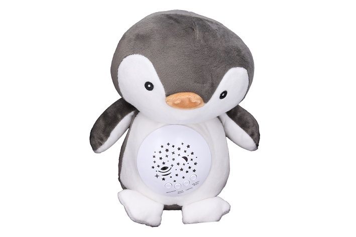Usínací tučňák plyšový. Rozměry 26x12x25 cm. Funkce světla - 7 barev, mohou se automaticky měnit. 10 melodií, 4 bílý šum. Možnost nastavení hlasitosti. Automatické vypnutí po 30 minutách. 3xAAA baterie, nejsou součástí.
