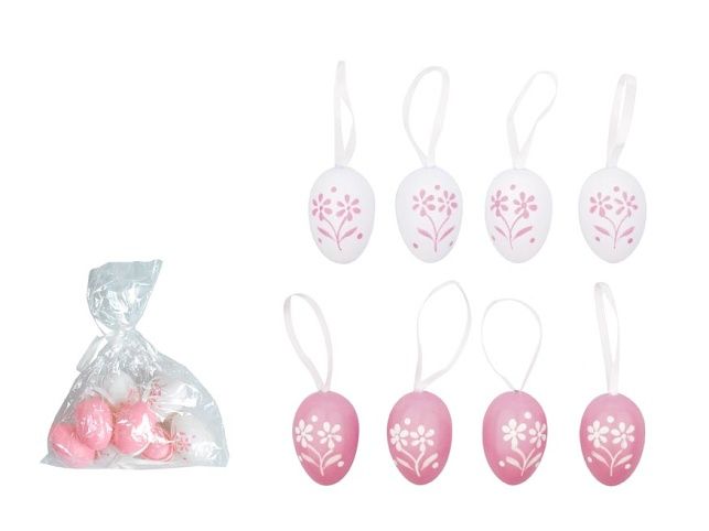 Vajíčka plastová růžová na zavěšení 4 cm, 8 ks v sáčku se 2 kytičkami