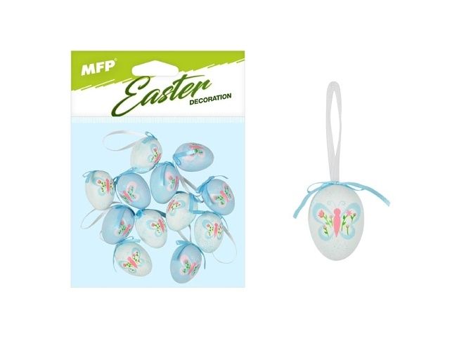 Vajíčka plastová v bílomodrých barvách na zavěšení. Krásná velikonoční dekorace barevných vajíček s motýlky a se stuhou na zavěšení poslouží jako dekorace do exteriéru nebo interiéru. Dekorace má provázek na zavěšení. Nalaďte se s námi na Velikonoce! Balení obsahuje: - 12 ks plastových vajíček Motiv: motýl Velikost: 40 mm Barva: bílá, modrá Uvedená cena je za 1 balení.