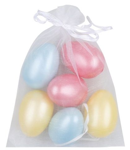 Vajíčka plastová pastelová na zavěšení 6 cm, 6 ks v organzovém pytlíku