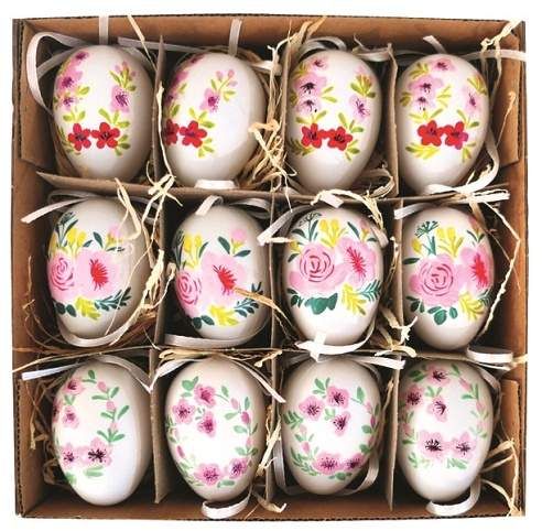 Plastová vajíčka s barevným dekorem květinek Vajíčka můžete použít k různým dekoračním a aranžérským účelům. Můžete s nimi ozdobit věnce, květinové vazby nebo je jednoduše zavěsit třeba na větvičku. Krásný design květinek se skvěle hodí do každého interiéru i exteriéru. 12 kusů vajíček v kraftové krabičce, mix motivů.