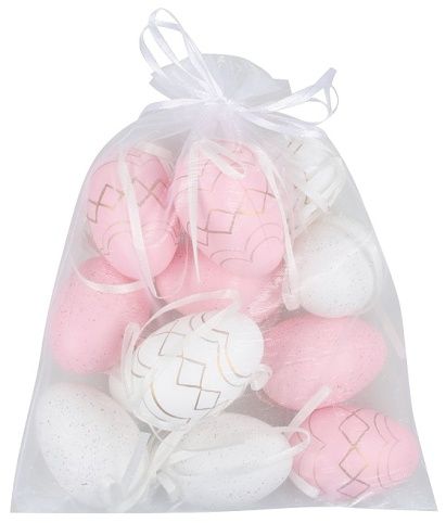 Vajíčka růžovobílá se zlatým zdobením 6 cm, 12 ks v organzovém pytlíku
