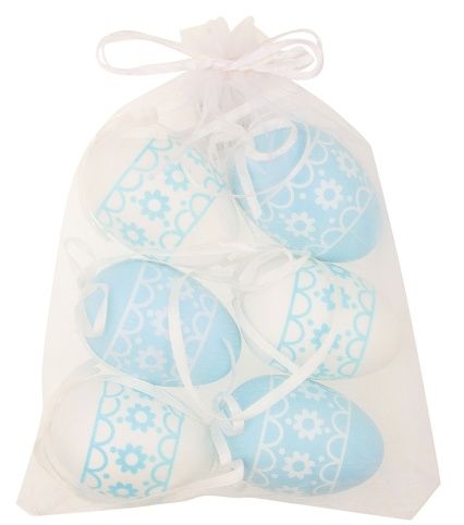 Vajíčka s kytičkami bílá/modrá plastová na zavěšení 6 cm, 6 ks v organze