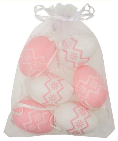 Vajíčka s kytičkami bílá/růžová plastová na zavěšení 6 cm, 6 ks v organze