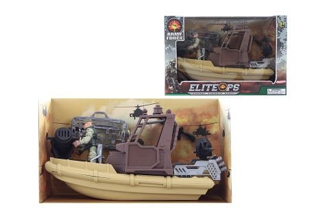 Sada válečné lodi s vojákem. Materiál plast. Baleno v krabici. Rozměry balení cca 27x18x11,5 cm. Velikost lodi 24 cm, velikost vojáka cca 8 cm. Věk 3+
