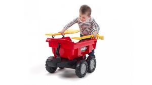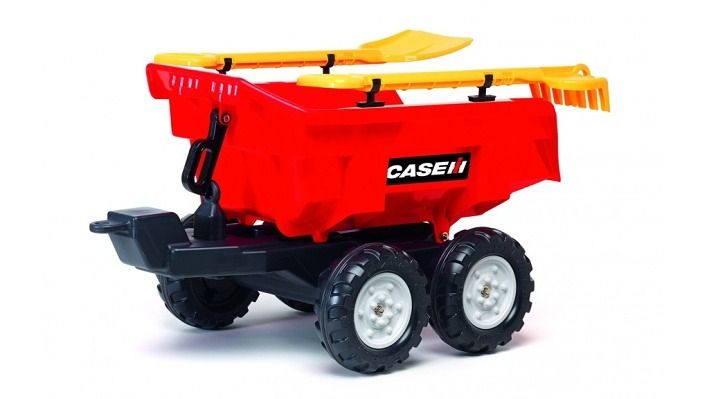Valník čtyřkolový Case Maxi červený s lopatou a hráběmi. Z vysoce