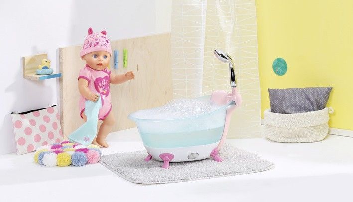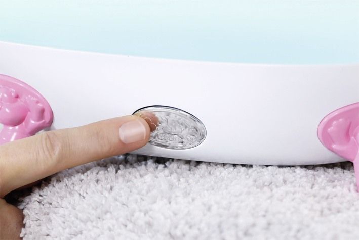 Pořádně si s BABY born® na zábavu ve vaně posviťte! Stisknutím tlačítka spustíš automatickou sprchu a aktivují se světelné a zvukové efekty. Základna vany se rozsvítí ve všech barvách duhy a když ze sprchovací hlavice teče voda, zazní k tomu melodie a zvuky koupání. Sprchu je možné trochu povytáhnout, aby se daly BABY born® snadno umýt i nožky. Spolu s BABY born® se ráda koupe i její gumová kačenka Berta, která poctivě hlídá, aby BABY born® nezůstala ve vaně tak dlouho, že by jí začaly růst ploutve.