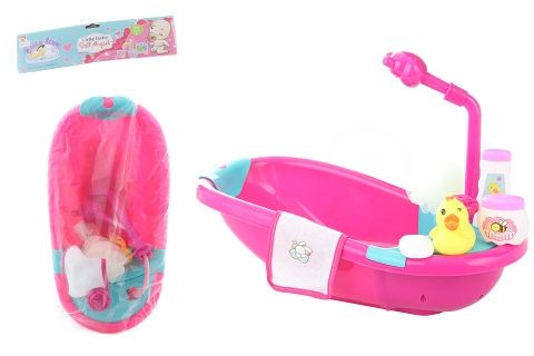 Plastová růžová vanička s doplňky. Balení obsahuje vaničku o velikosti cca 38 x 19,5 x 14 cm, sprchu, kachničku, houbu, ručník, mýdlo a další doplňky. Rozměry balení cca 27 x 54 x 14 cm. Věk 3+