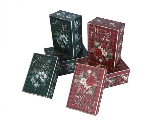 Stylová vánoční dárková krabička s květinovým motivem a nápisem Merry Christmas. V elegantním kostkovaném vzoru – červeném nebo zeleném provedení. Ideální pro balení dárků, kosmetiky, oblečení či dekorací.