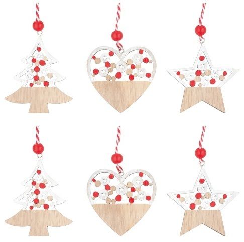 Dekorace na zavěšení6 ks v baleníDetaily s glitremDřevěné ozdoby s vánočními motivy na zavěšení na stromek nebo jen tak do interiéru. Balení obsahuje dekoraci stromku, srdíčka a hvězdy na šňůrce s červeným dřevěným korálkem a červeným dekorem.
