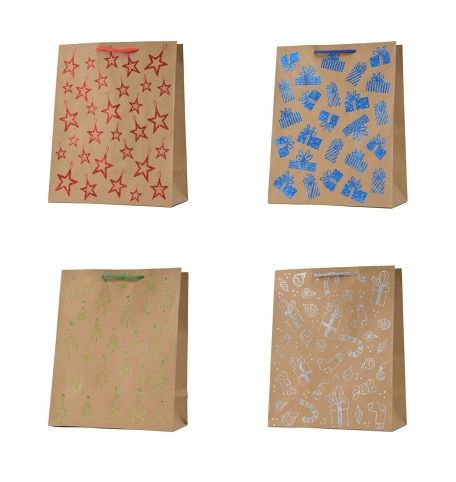 Papírová taška kraft s brokátem, balení obsahuje 12ks, mix motivů.